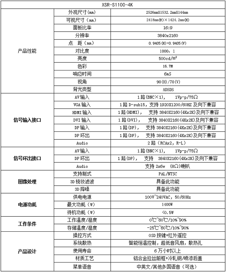 新視銳110寸4倍高清液晶顯示器性能參數: