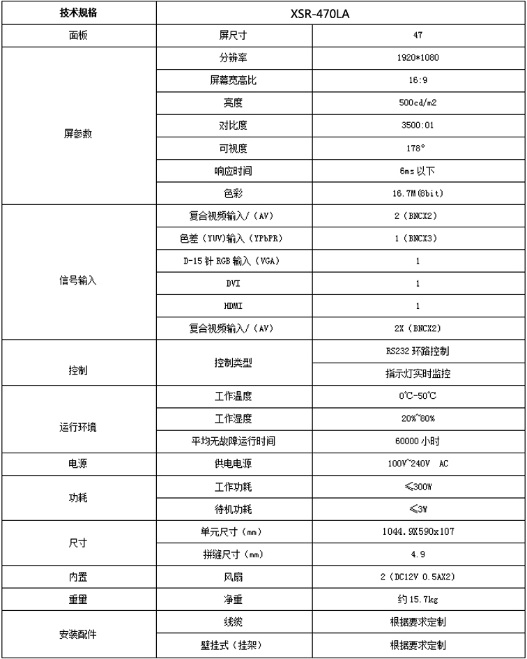新視銳47寸超窄邊4.9mm拼縫液晶拼接單元產(chǎn)品參數(shù):